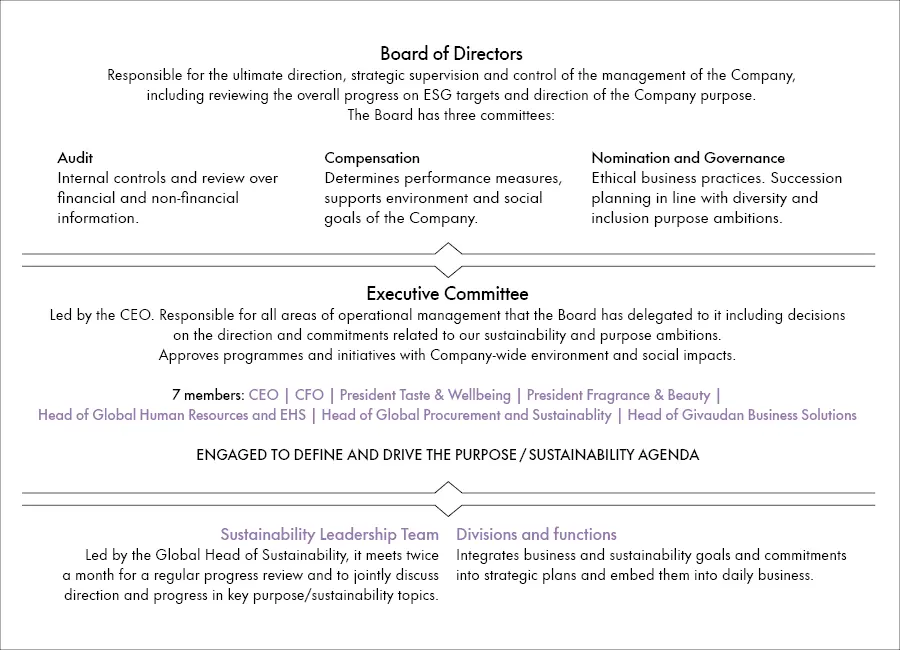 The Executive Committee (EC) leads Givaudan’s overall strategic direction and is accountable for our purpose and Sustainability ambitions. Topics related to purpose/sustainability ambitions form part of the regular EC meeting agenda so that progress and pending decisions can be discussed.